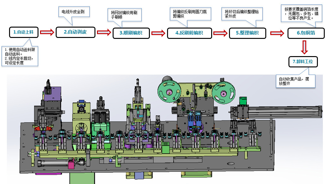 自動/人(rén)工(gōng)放(fàng)料入治具→ 自動剝外被→自動順刷編織→自動反刷剪編織→整理(lǐ)編織→自動包銅箔→ 自動取線。